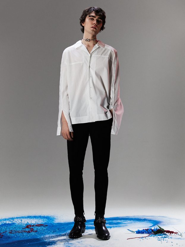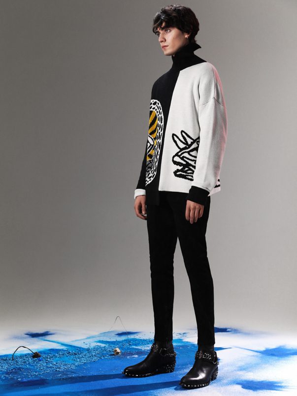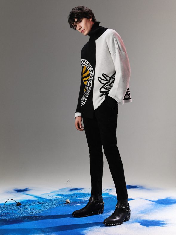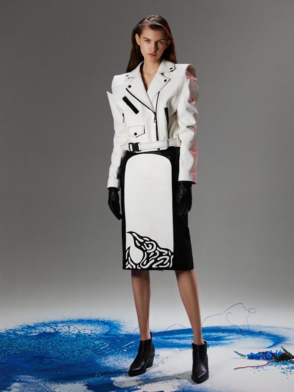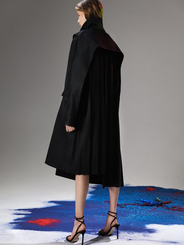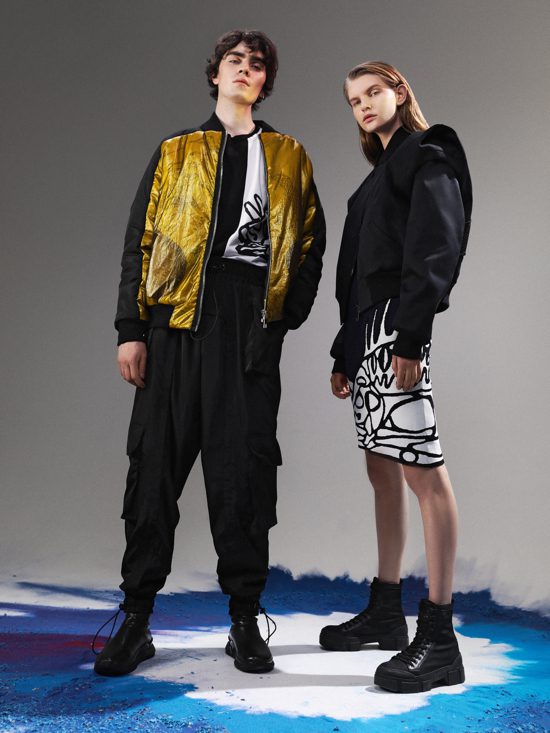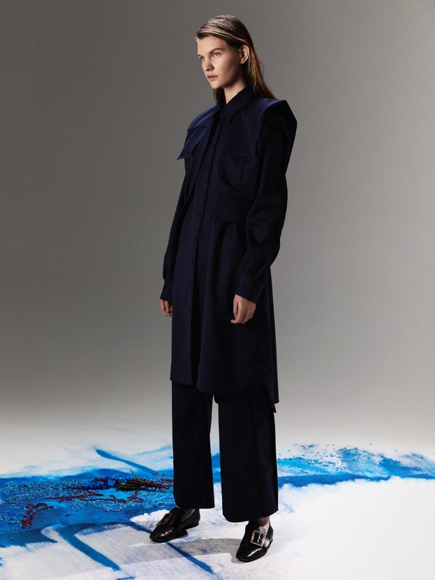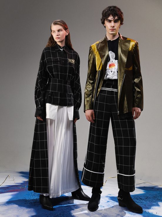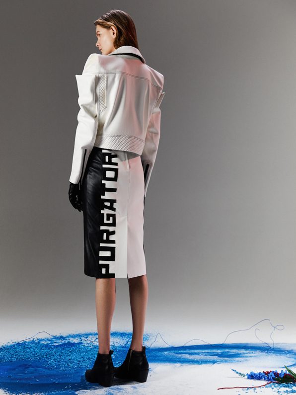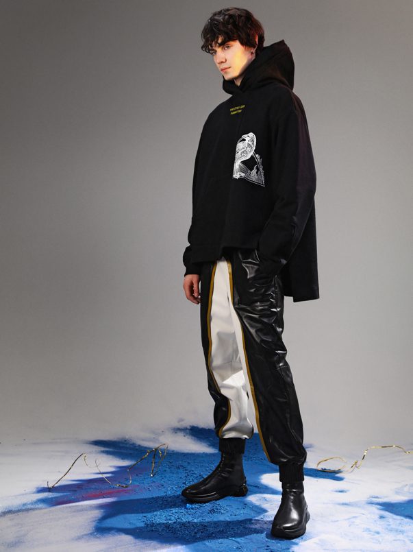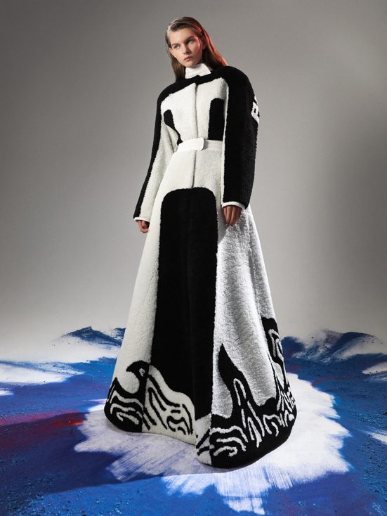 This new collection is the first part of a planned trilogy of meditations on the structures within our societies. As per usual, the collection features fashions for both her and him – the women’s segment featured leather jackets and raincoats with overstated shoulder pads, bright dual-colored sheepskin coats, woolen trousers, and jackets with multi-layer draperies, hi-tech windbreakers and bomber jackets, multi-layer dresses and black & white leather pencil skirts.