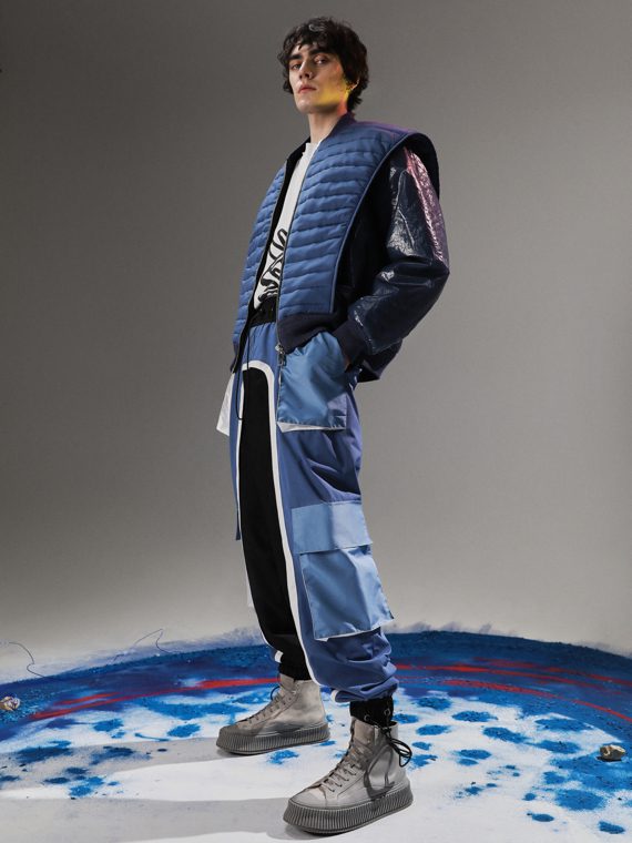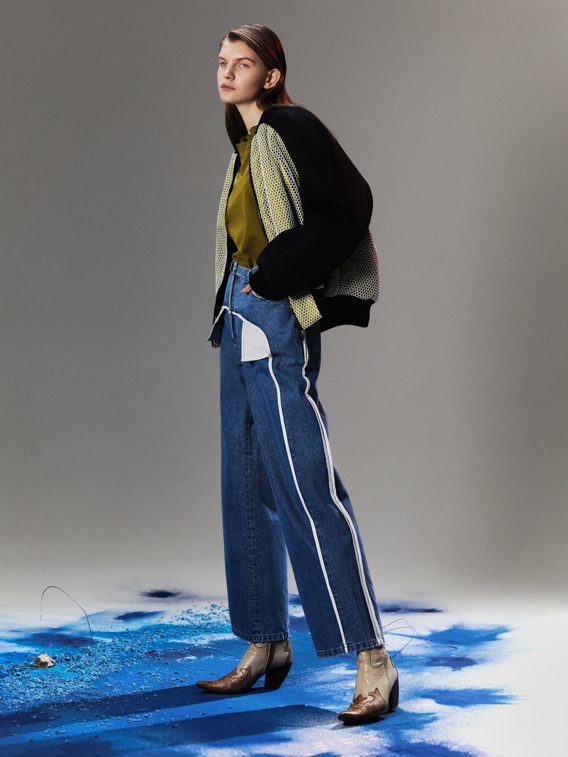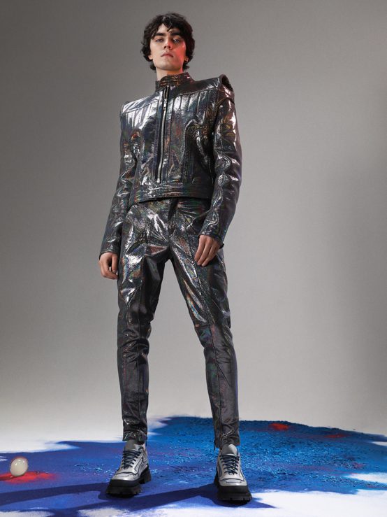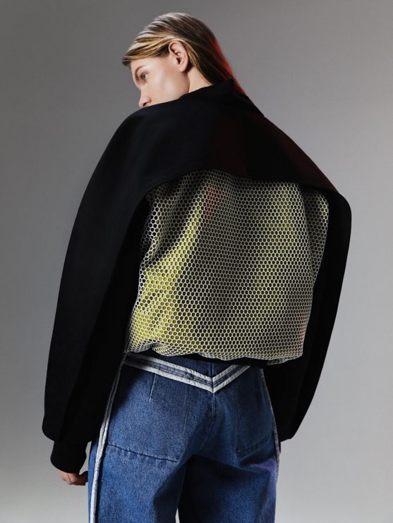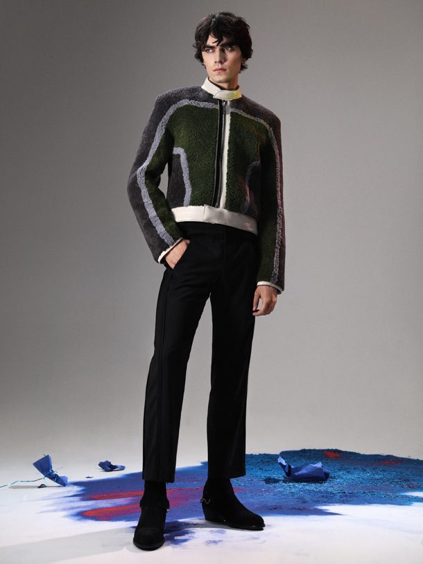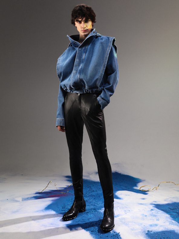 The men’s part showcased asymmetric double-colored sweaters, sophisticated tailored trousers with patch pockets, voluminous jean fabric jackets, hi-tech bomber jackets made of several contrasting fabrics, sheepskin jackets, as well as masculine leather jackets and coats.